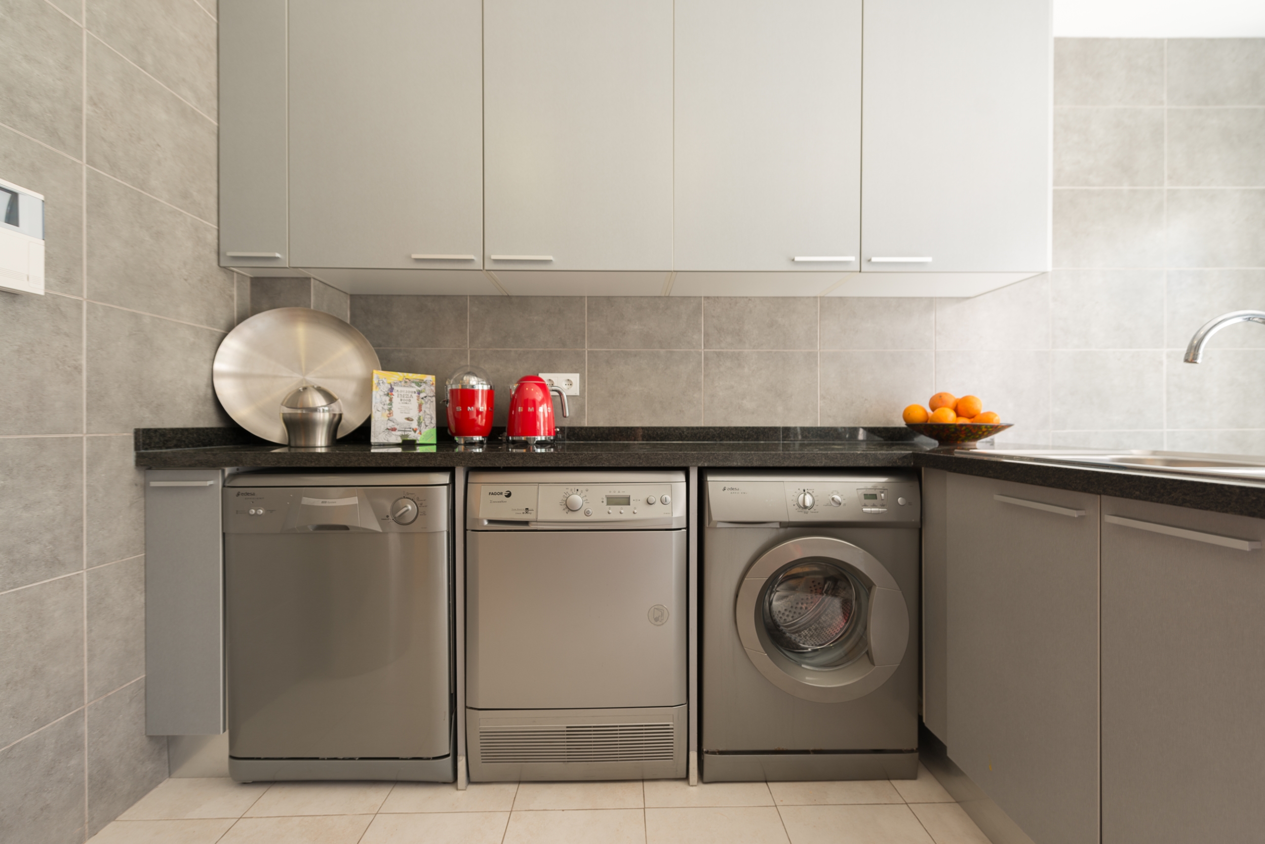 The modern interiors feature elegant design with bright splashes of colour. The living room is adjacent to the dining room which features a dining table for ten guests, and overlooks the pool area, the kitchen is fully equipped with all modern appliances. The second living room (upstairs) has a sofa, coffee table, TV and a balcony.