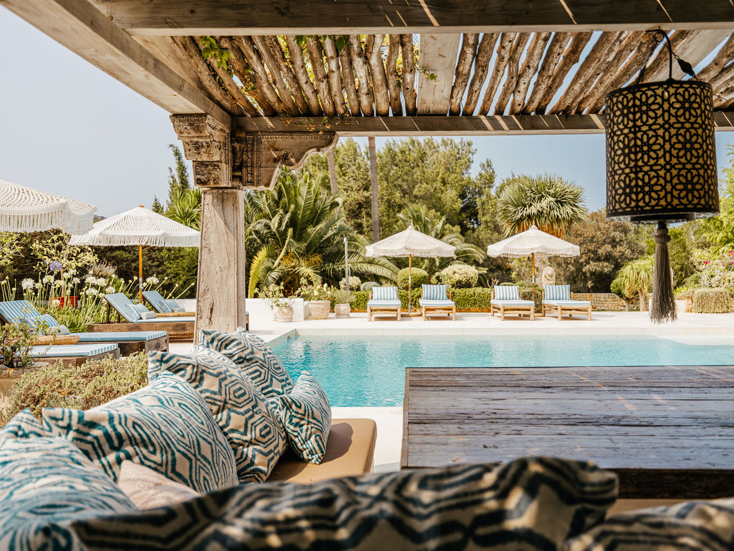 Beyond the pool terrace, palm-filled gardens, sun-kissed lawns and shady courtyards offer further places to relax. Closer to the house, on an upper terrace, an al-fresco dining area with barbeque seats eight.
